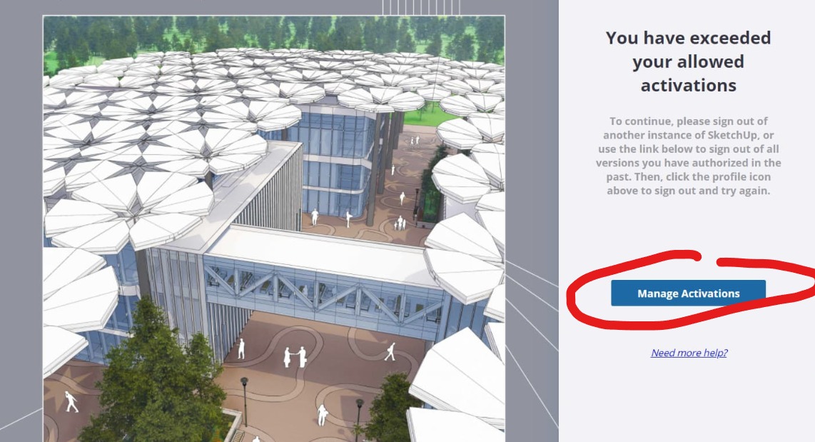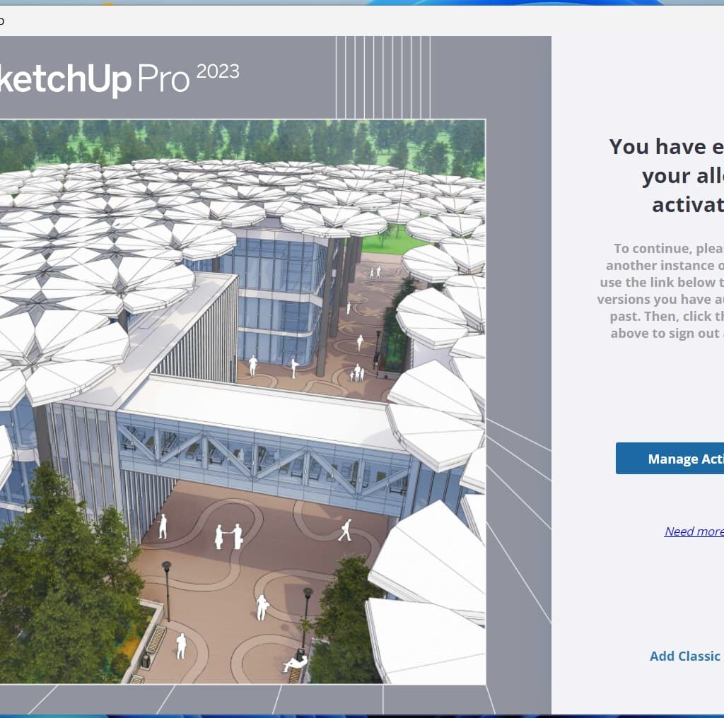 • Tip: หากคุณพบข้อความผิดพลาดในโปรแกรม SketchUp ให้คลิกปุ่ม “Manage Activations” (จัดการการเปิดใช้งาน) ซึ่งจะนำคุณไปยังหน้าเข้าสู่ระบบโดยตรง