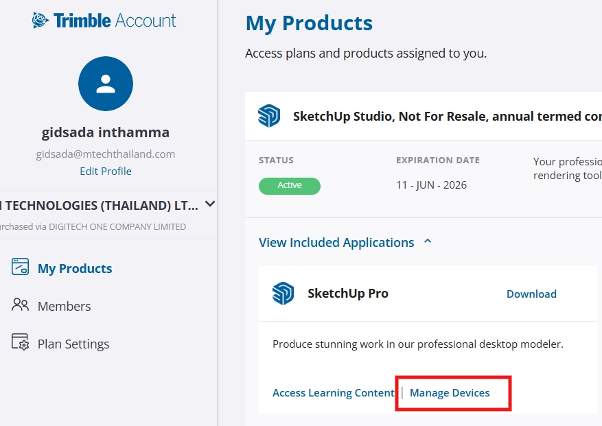 • มองหา “SketchUp Pro” แล้วคลิกที่ลิงก์ “Manage Devices” (จัดการอุปกรณ์)