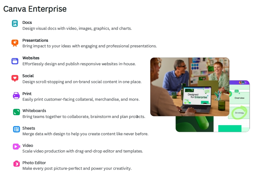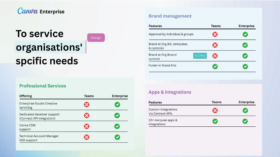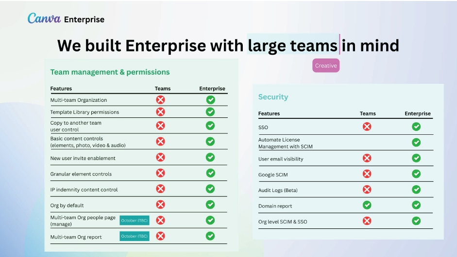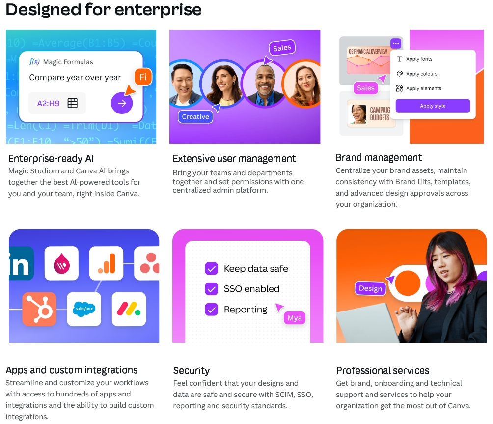 | AI & Design Tools | High access (e.g., 25+ Magic tools, unlimited resize/translate, limited Veo 3 video) | Same as Pro + on-brand AI generation, team insights/reports | Higher limits + AI permissions/controls, indemnity for outputs (100+ seats); custom AI integrations |