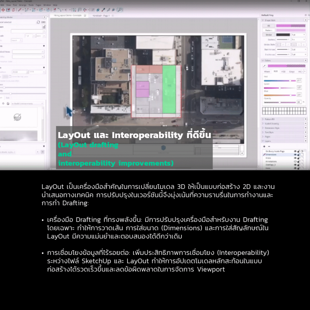 LayOut เป็นเครื่องมือสำคัญในการเปลี่ยนโมเดล 3D ให้เป็นแบบก่อสร้าง 2D และงานนำเสนอทางเทคนิค การปรับปรุงในเวอร์ชันนี้จึงมุ่งเน้นที่ความราบรื่นในการทำงานและการทำ Drafting:
